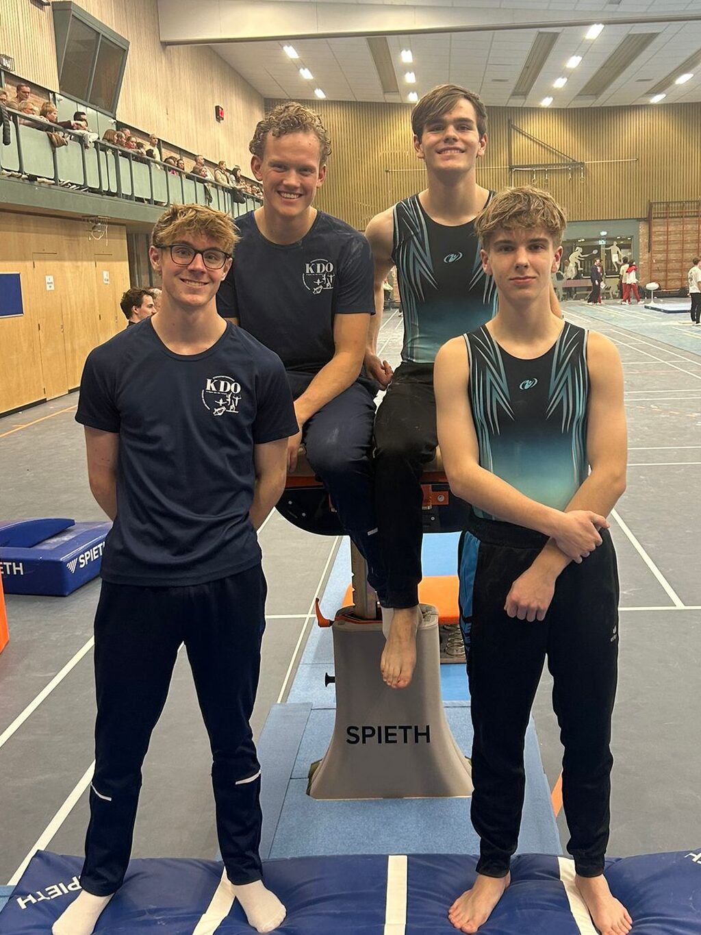 Afgelopen zondagmiddag reisden Bjorn en Tom samen met hun teamgenoten Christian en Joris van KDO Krimpen af naar het Brabantse Goirle voor hun allereerste landelijke wedstrijd in niveau 3. Het deelnemersveld was sterk vertegenwoordigd, maar de heren gingen vol energie de uitdaging aan met als doel zich te meten in het deelnemersveld. Een prachtige kans om de elementen waar ze de afgelopen weken hard op hebben getraind te laten zien en hun oefeningen naar een hoger niveau te tillen. Tijdens een teamwedstrijd turnen drie heren per toestel, waardoor de Ouderkerkse en Krimpense turners elkaar perfect aanvulden om een zo hoog mogelijk teamresultaat neer te zetten. Hieronder een verslag van de Ouderkerkse heren hoe hun wedstrijd verliep.